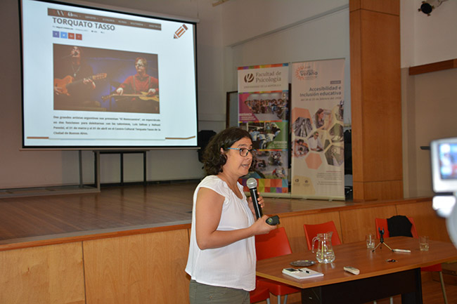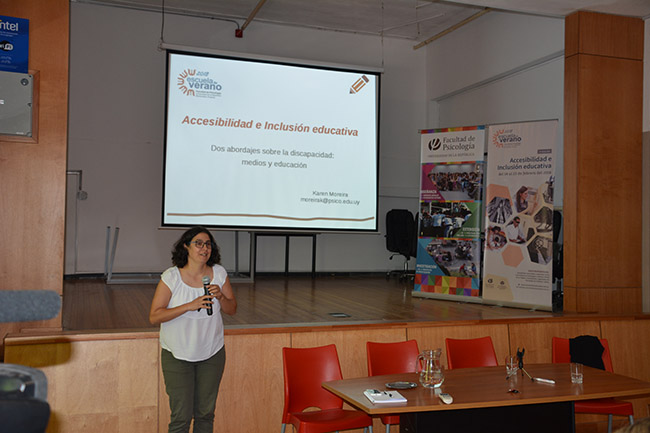 Disertó luego, la Prof. Adj. Karen Moreira, docente del Instituto de Fundamentos y Métodos en Psicología de la Facultad de Psicología (UR), quien trabajó sobre dos abordajes en relación a la discapacidad: medios de comunicación y educación.