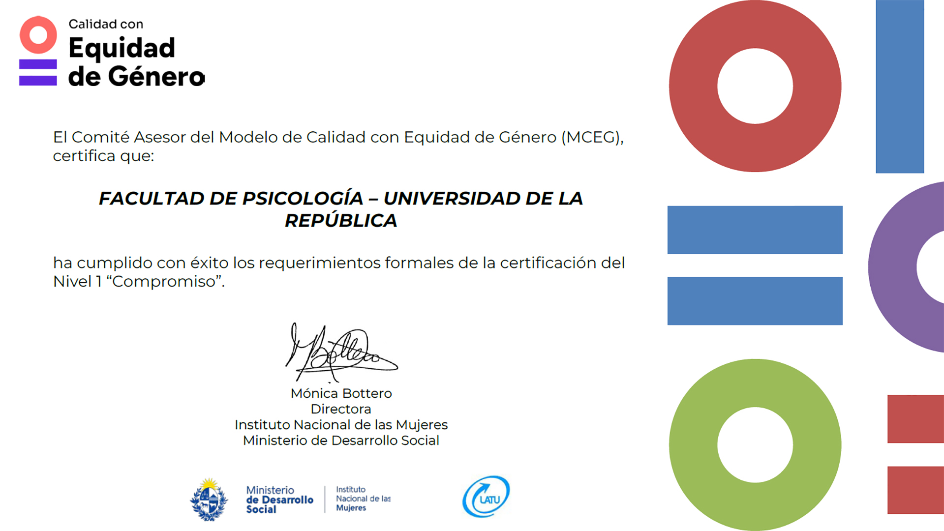 En el marco de esta actividad, la Facultad de Psicología, junto con las Facultades de Ingeniería, Odontología , recibieron el Certificado del Nivel 1 en el Modelo de Calidad con Equidad de Género, al tiempo que la Facultad de Veterinaria alcanzó el Nivel 2. La ceremonia contó con la participación de autoridades de los cuatro servicios certificados e integrantes de sus Comités y Comisiones de Género.