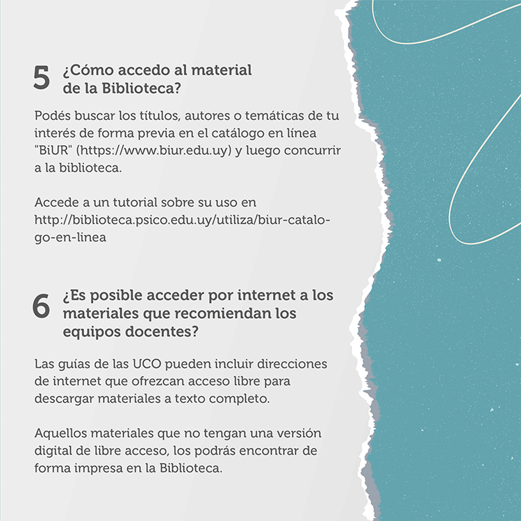 Podés buscar los títulos, autores o temáticas de tu interés de forma previa en el catálogo en línea "BiUR" (https://www.biur.edu.uy) y luego concurrir a la biblioteca.