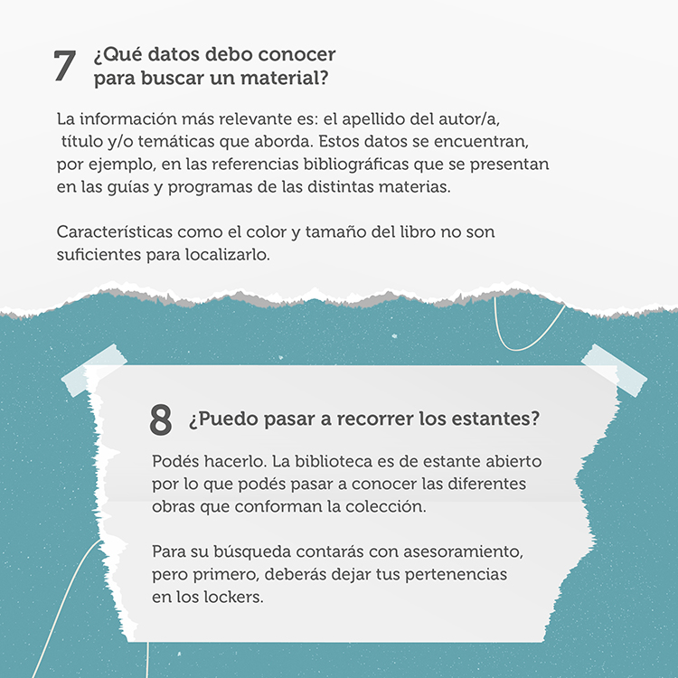 La información más relevante es: el apellido del autor/a, título y/o temáticas que aborda. Estos datos se encuentran, por ejemplo, en las referencias bibliográficas que se presentan en las guías y programas de las distintas materias. Características como el color y tamaño del libro no son suficientes para localizarlo.