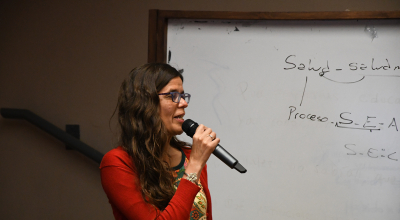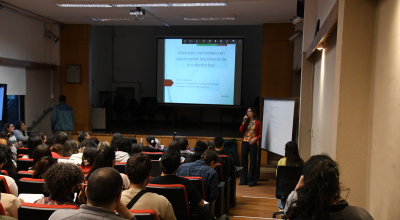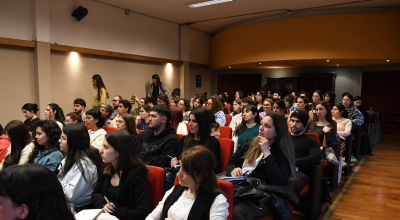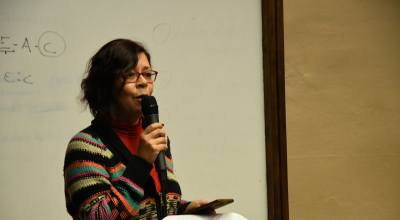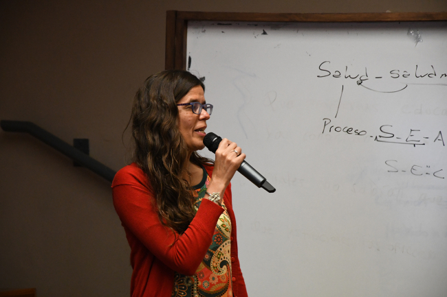 En un salón de actos Élida Tuana, la doctora en Psicología argentina, Claudia Bang, ofreció la conferencia Abordajes comunitarios en salud mental: la potencia de lo colectivo hoy, invitada por el Programa Practicantado en Psicología organizado en convenio por la Facultad de Psicología de la Universidad de la República y la Intendencia de Montevideo.