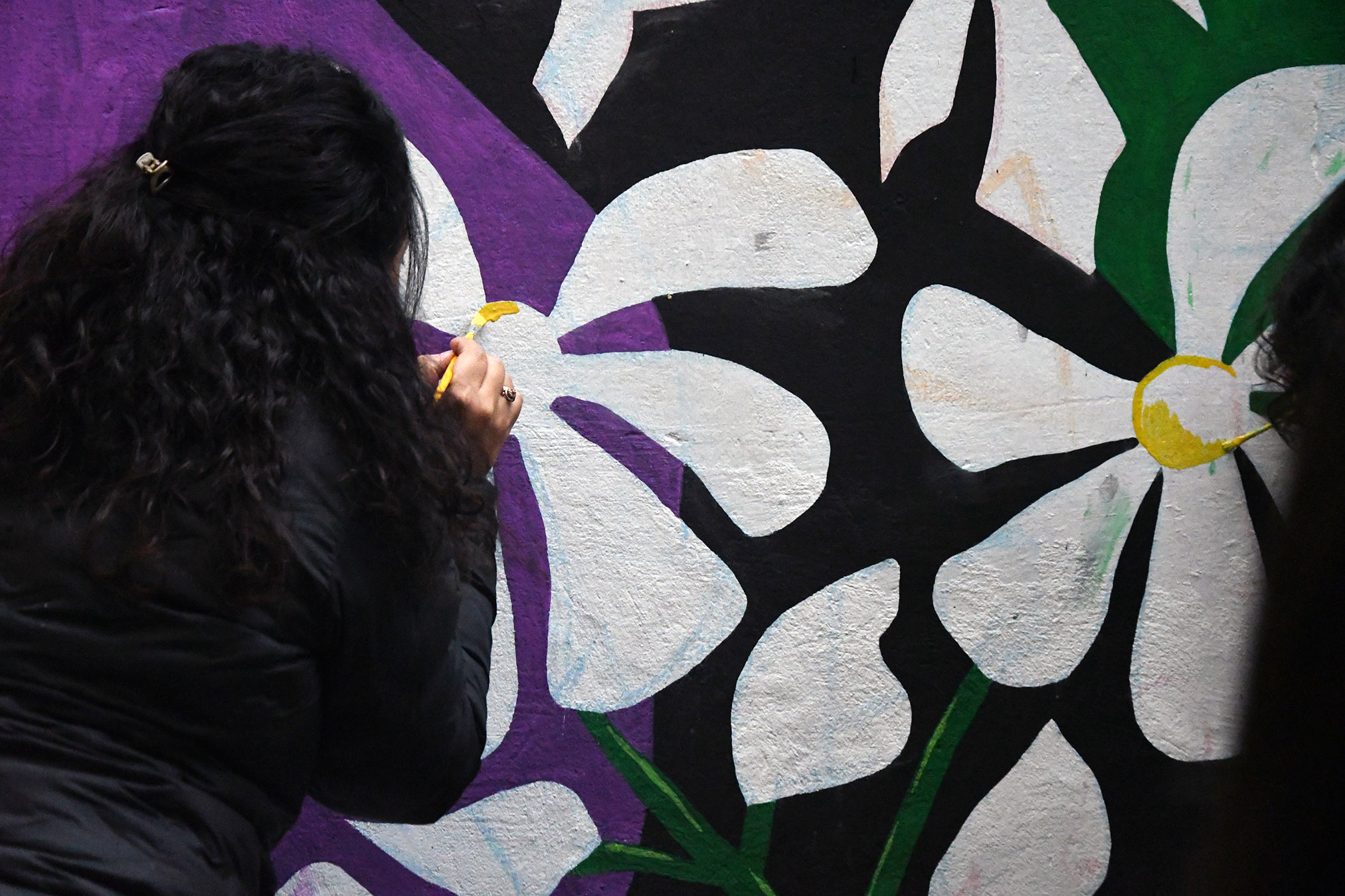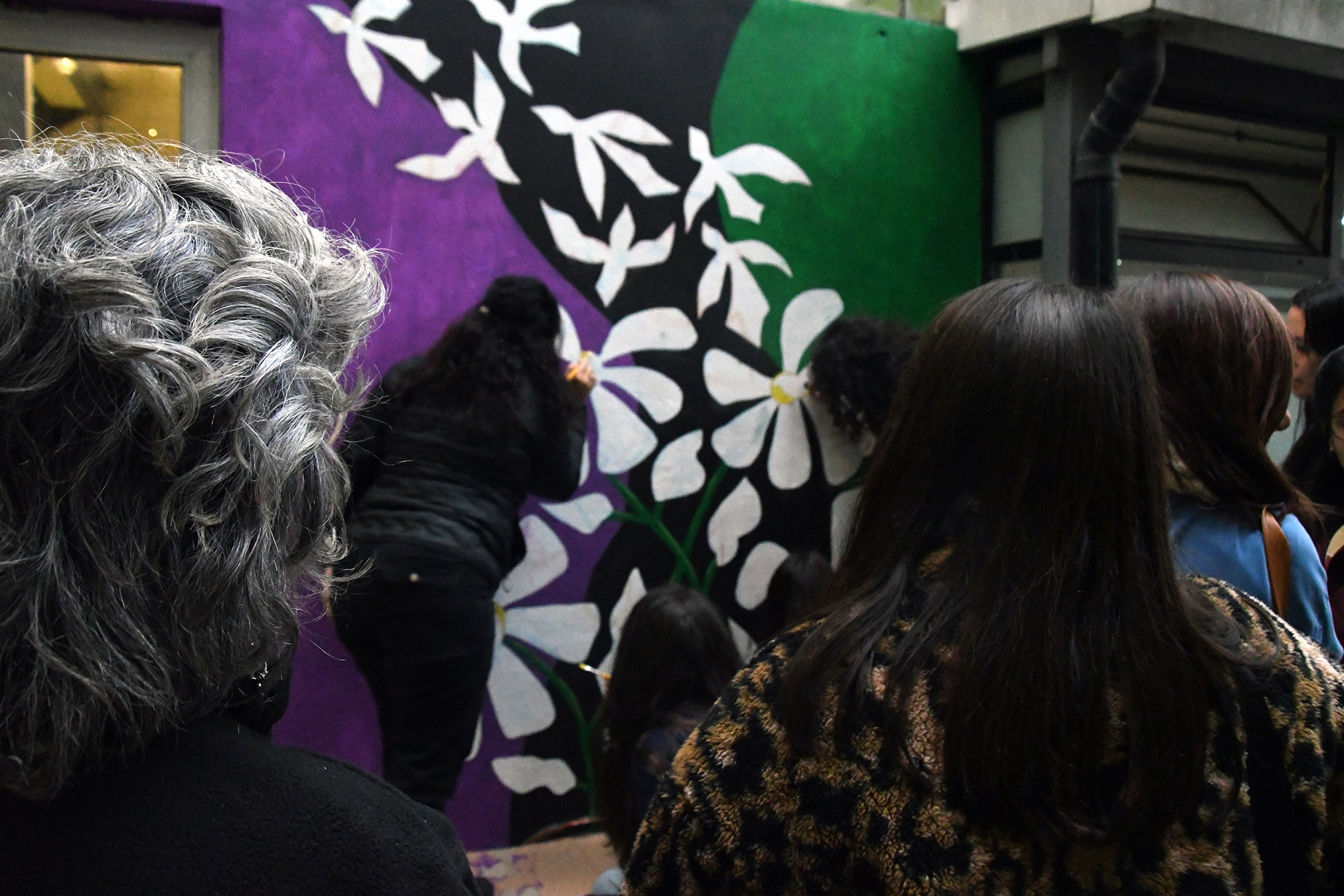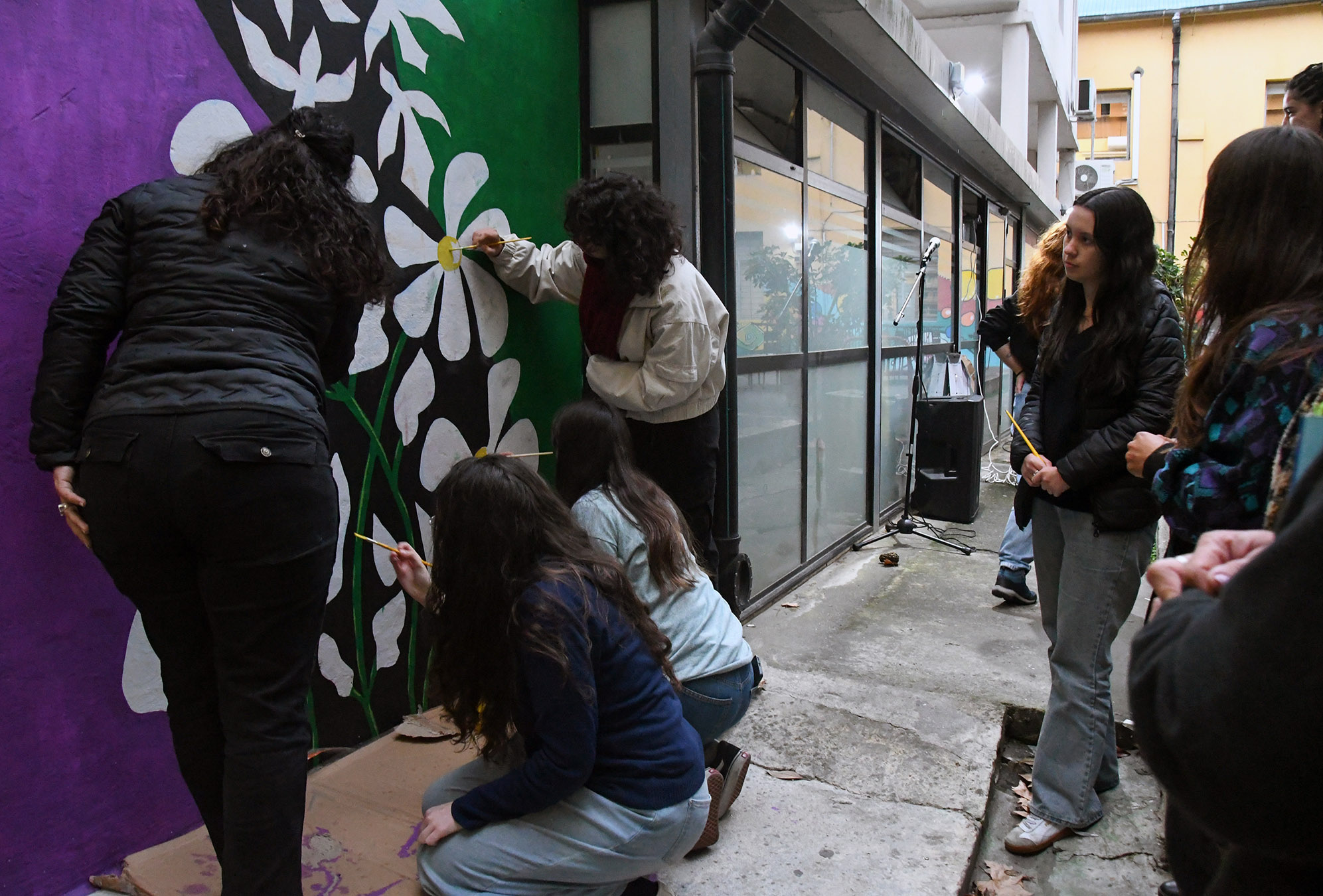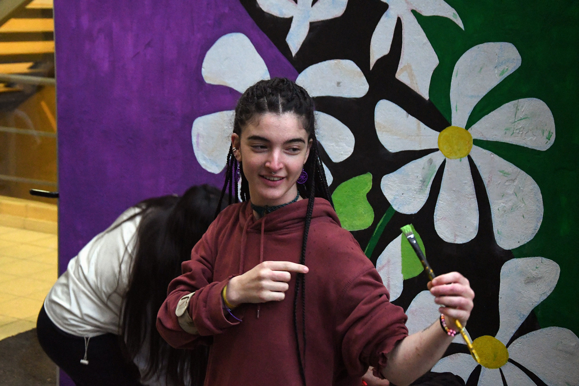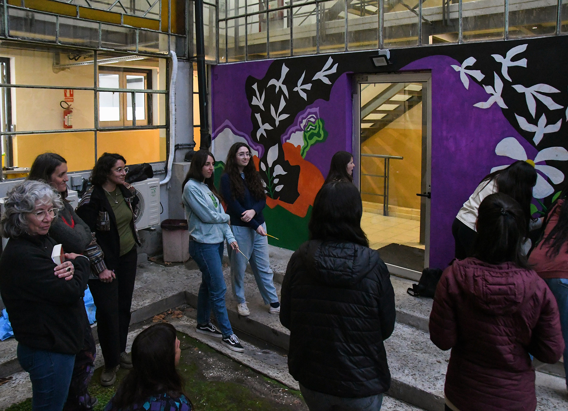 La artista Victoria Falkin había sembrado un bosque de símbolos sobre una pared del patio próxima al baño de mujeres: flores que insisten en crecer y la conexión entre cuerpo y naturaleza; pájaros en vuelo y el simbolismo de las margaritas sin un pétalo evocando la ausencia, la esperanza del regreso, la libertad y la memoria de las personas desaparecidas. Y este día llegaron muchas manos, de estudiantes, docentes y funcionarias, que se animaron a seguir la línea, a dejar su trazo y a hacer suyo ese mural compartido.