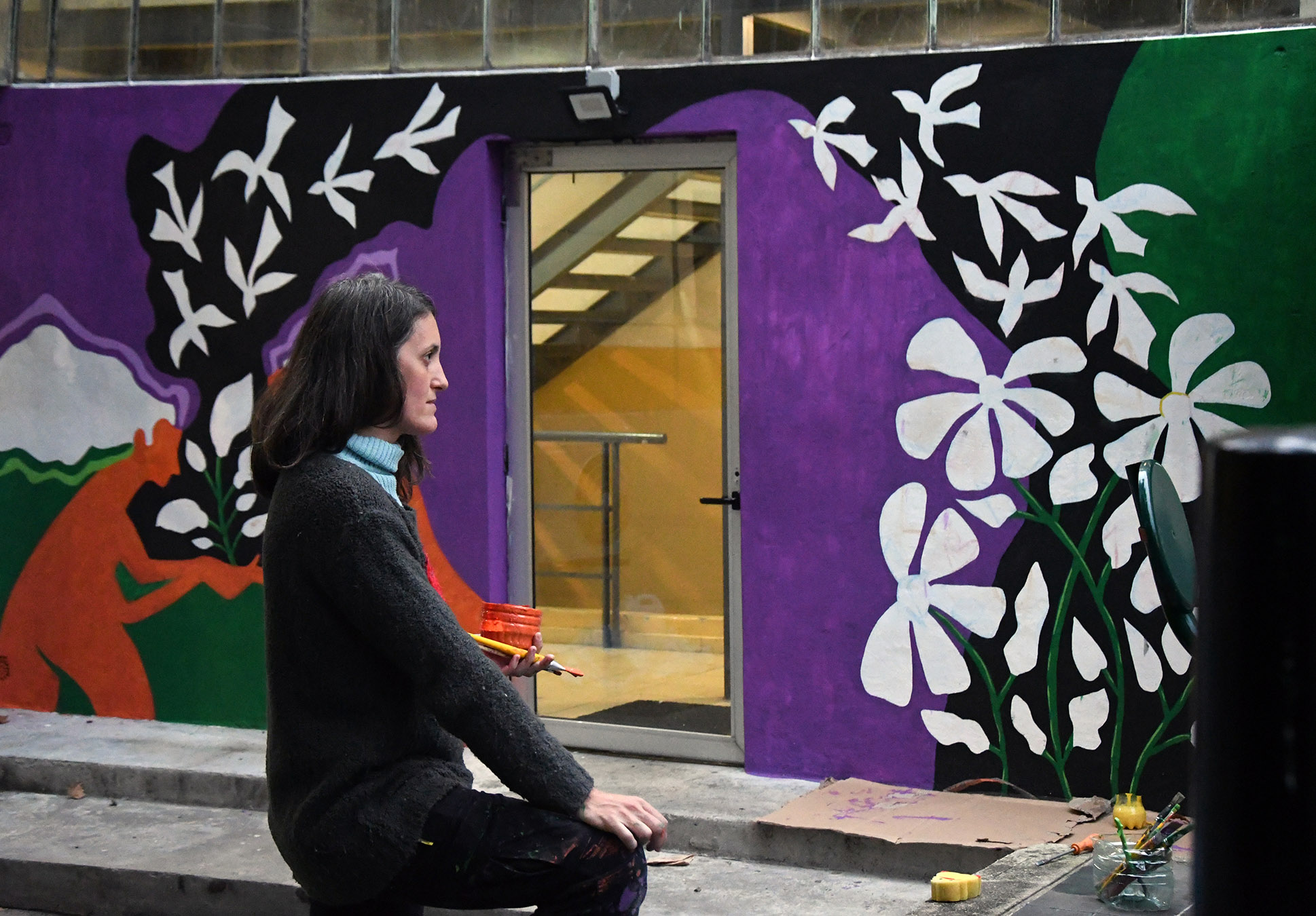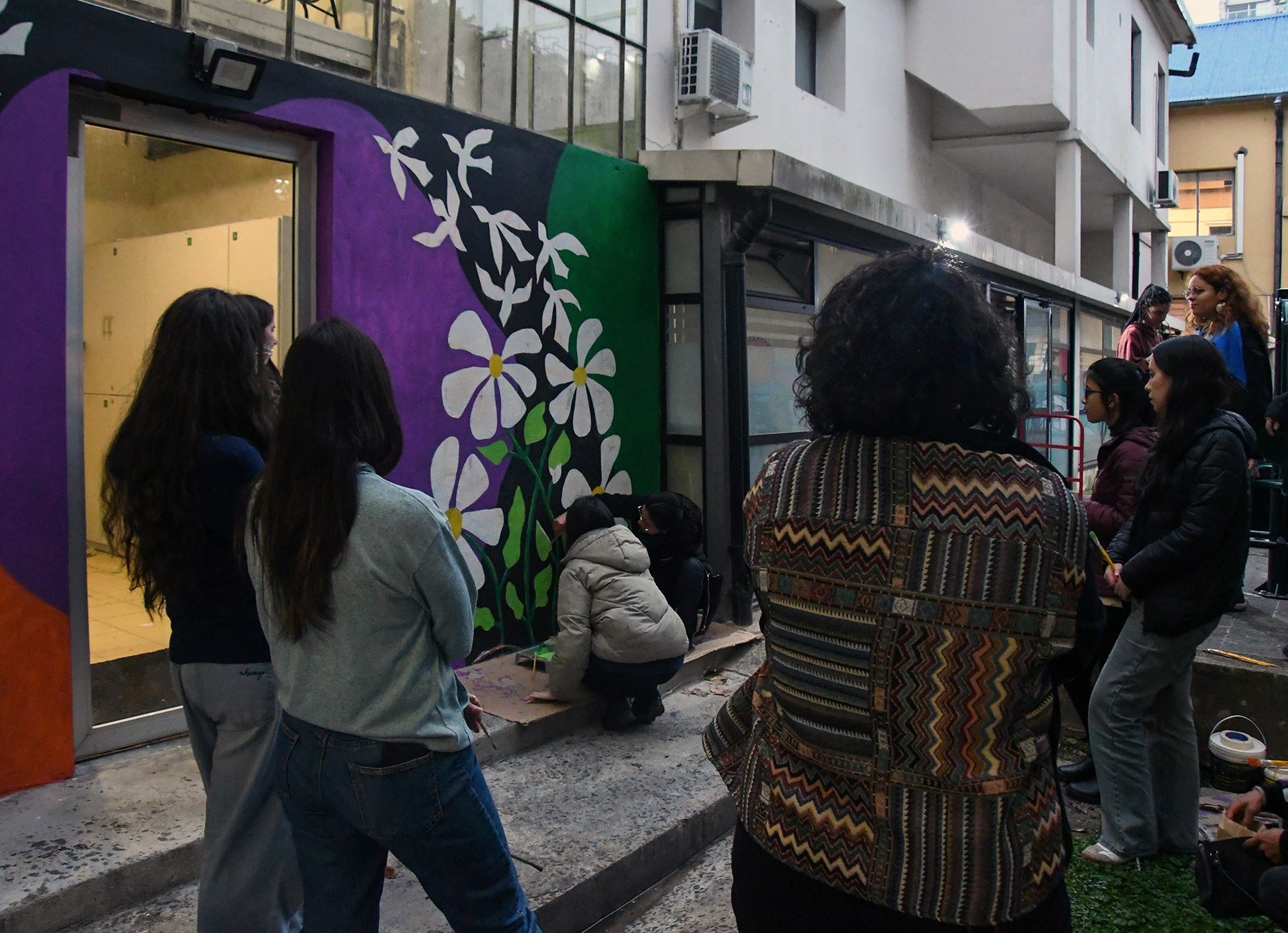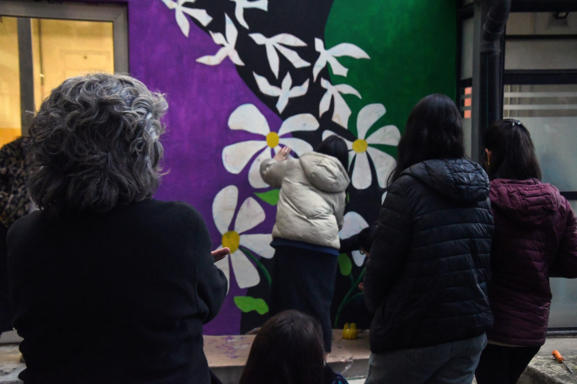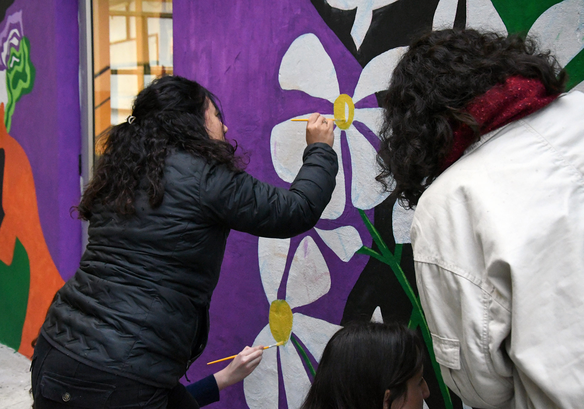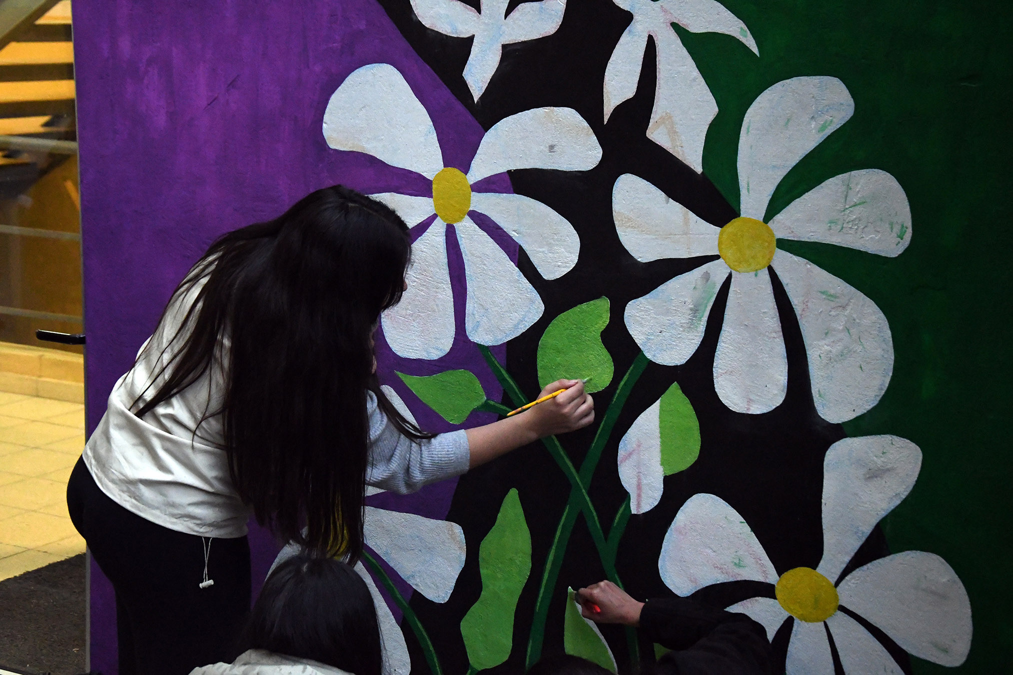 La artista Victoria Falkin había sembrado un bosque de símbolos sobre una pared del patio próxima al baño de mujeres: flores que insisten en crecer y la conexión entre cuerpo y naturaleza; pájaros en vuelo y el simbolismo de las margaritas sin un pétalo evocando la ausencia, la esperanza del regreso, la libertad y la memoria de las personas desaparecidas. Y este día llegaron muchas manos, de estudiantes, docentes y funcionarias, que se animaron a seguir la línea, a dejar su trazo y a hacer suyo ese mural compartido.