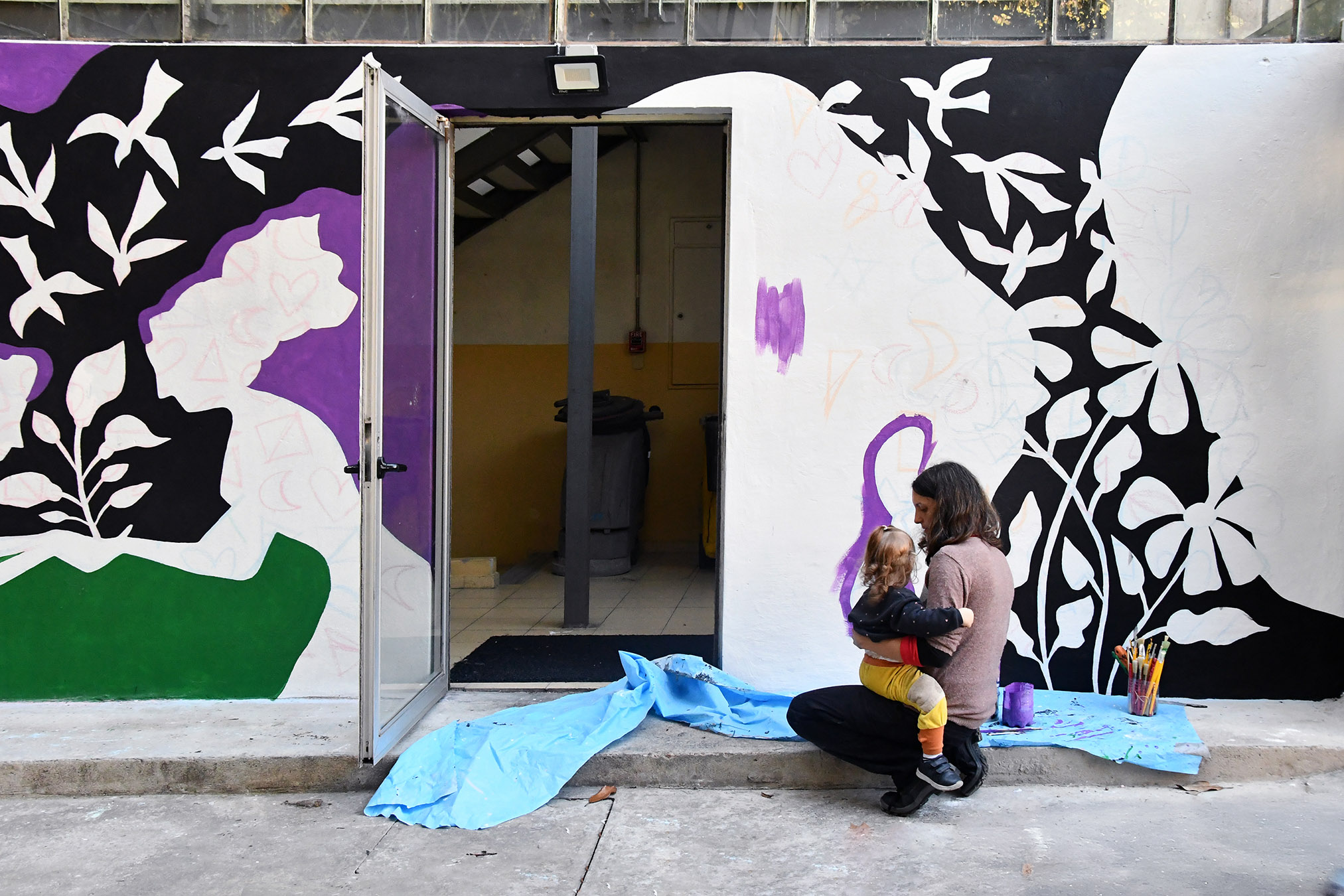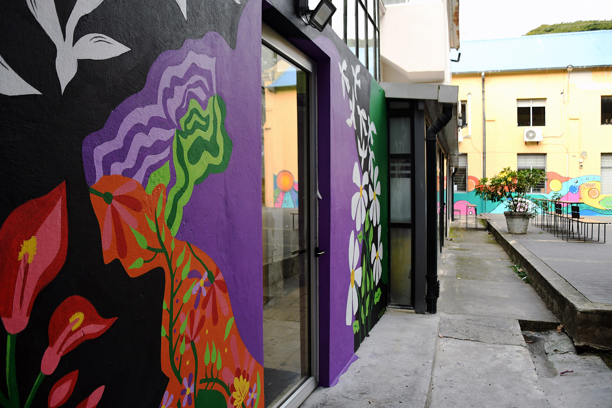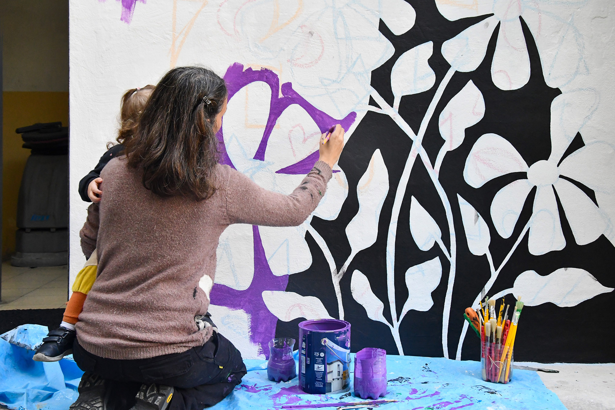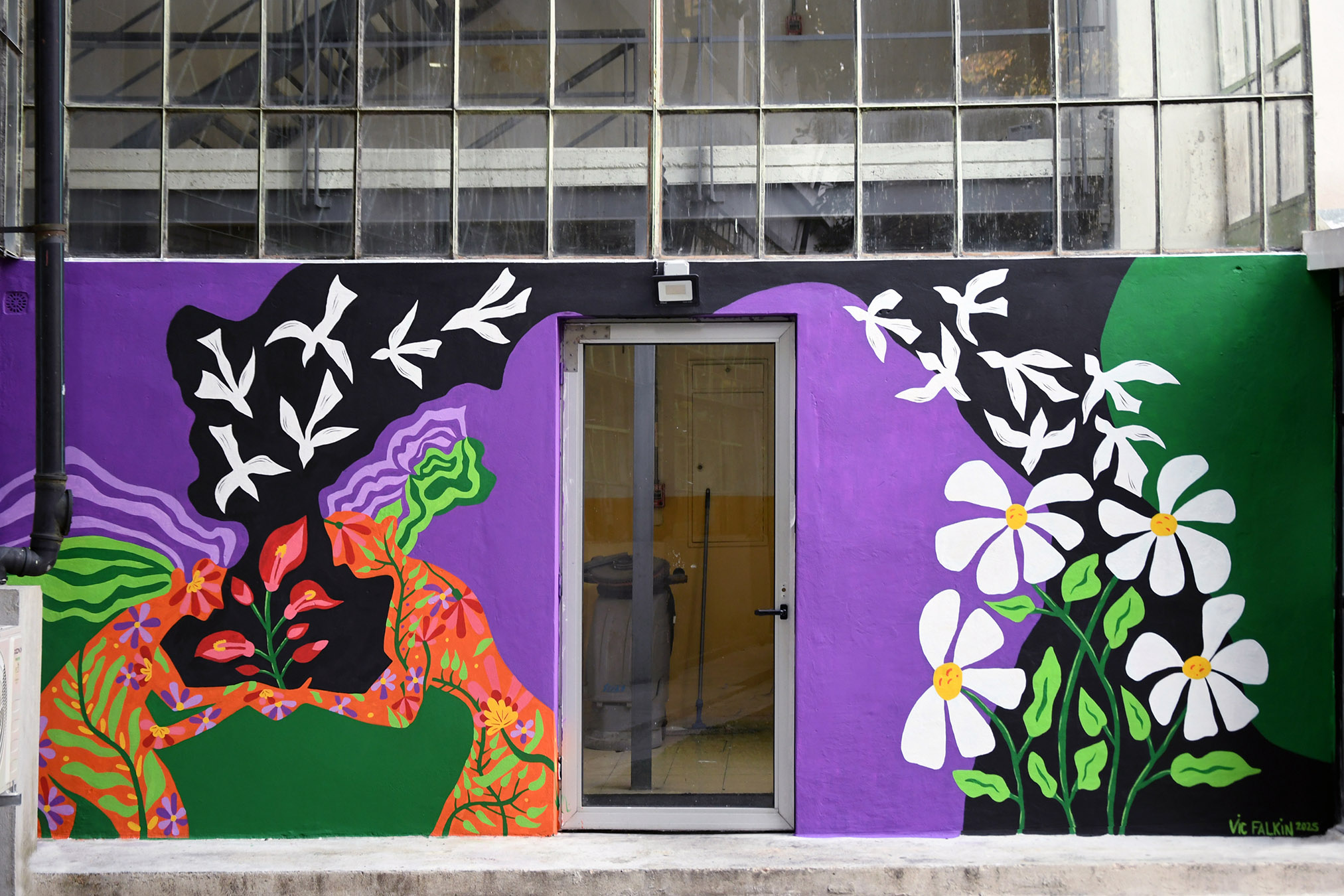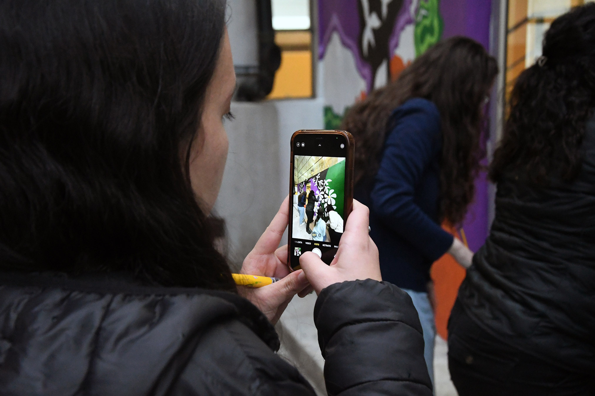 La artista Victoria Falkin había sembrado un bosque de símbolos sobre una pared del patio próxima al baño de mujeres: flores que insisten en crecer y la conexión entre cuerpo y naturaleza; pájaros en vuelo y el simbolismo de las margaritas sin un pétalo evocando la ausencia, la esperanza del regreso, la libertad y la memoria de las personas desaparecidas. Y este día llegaron muchas manos, de estudiantes, docentes y funcionarias, que se animaron a seguir la línea, a dejar su trazo y a hacer suyo ese mural compartido.