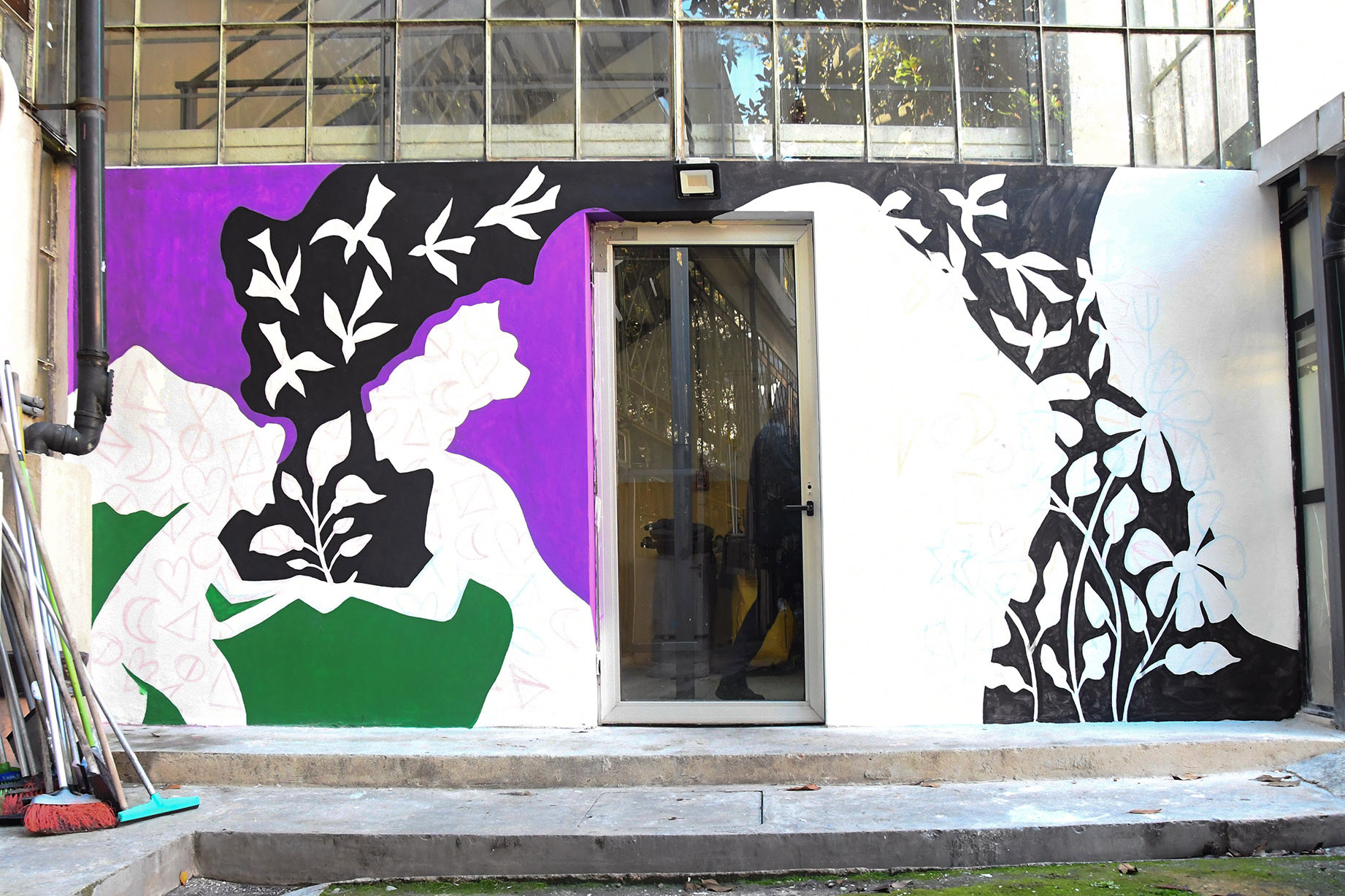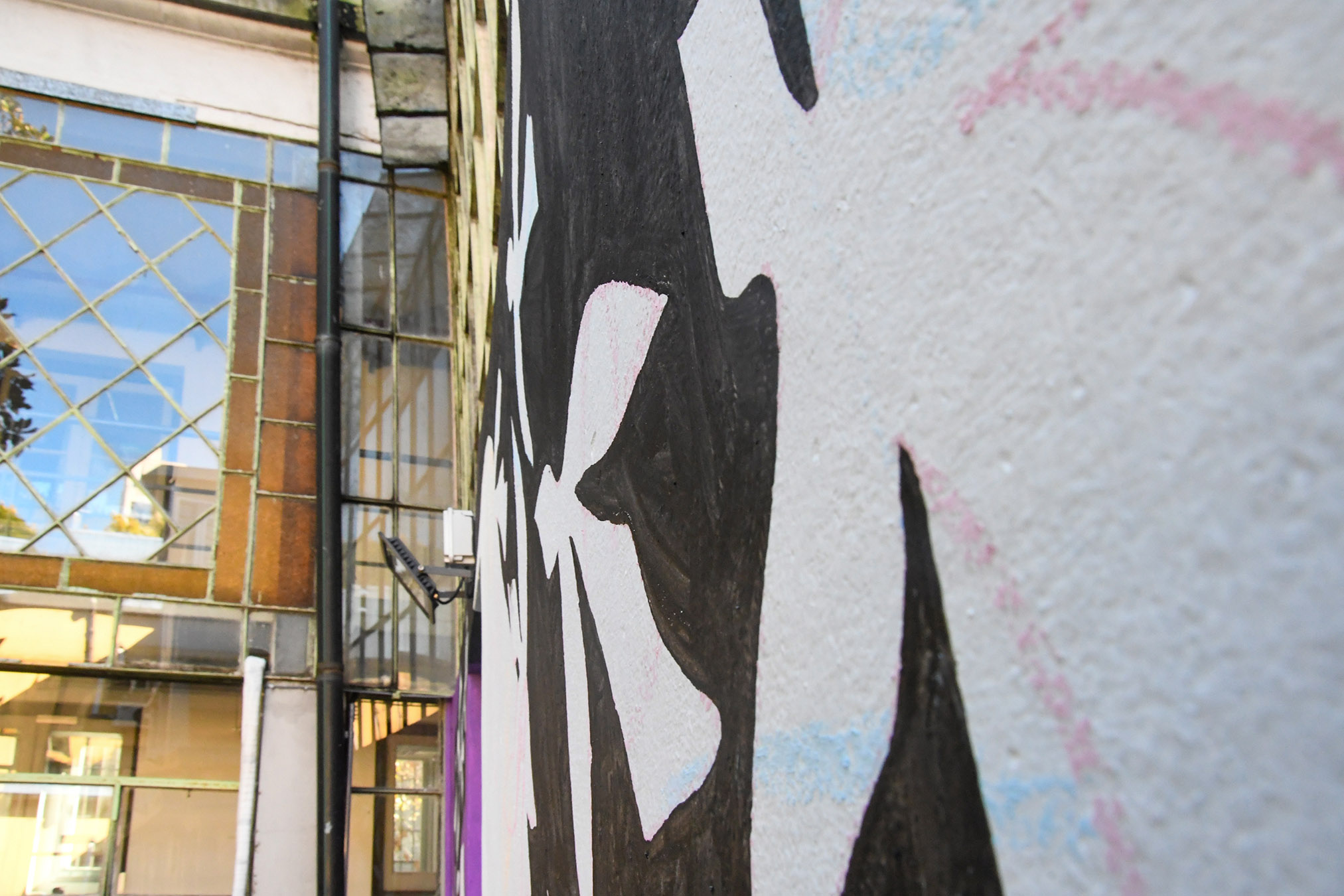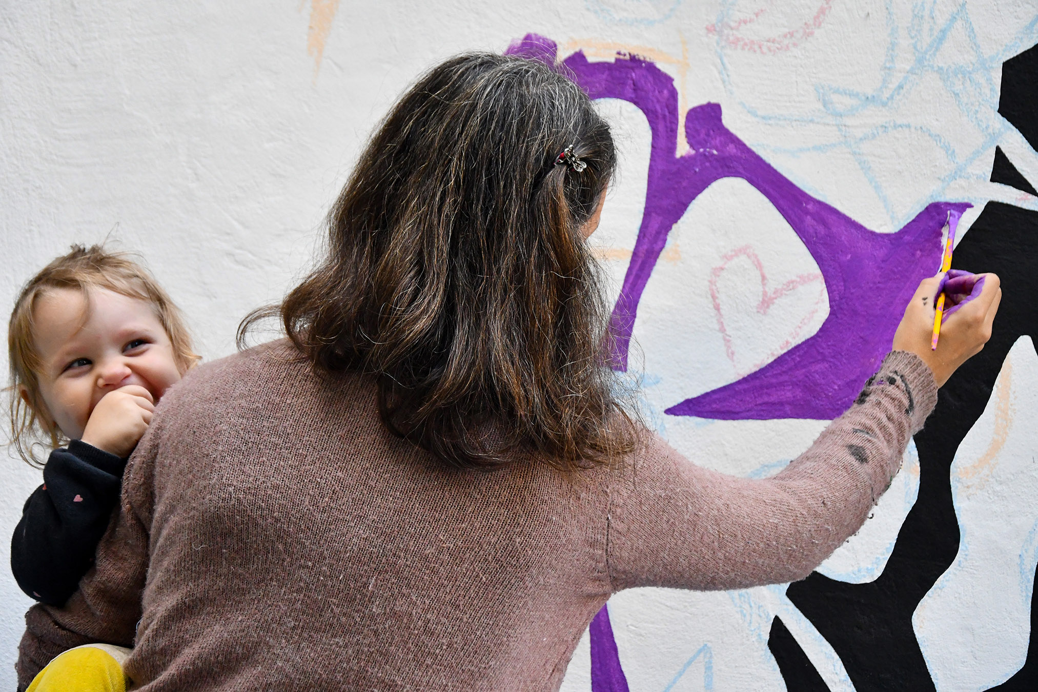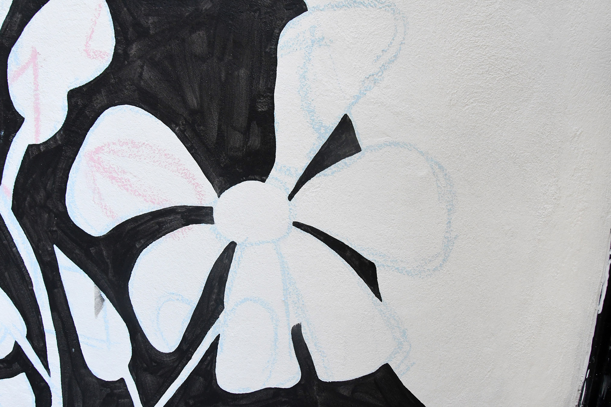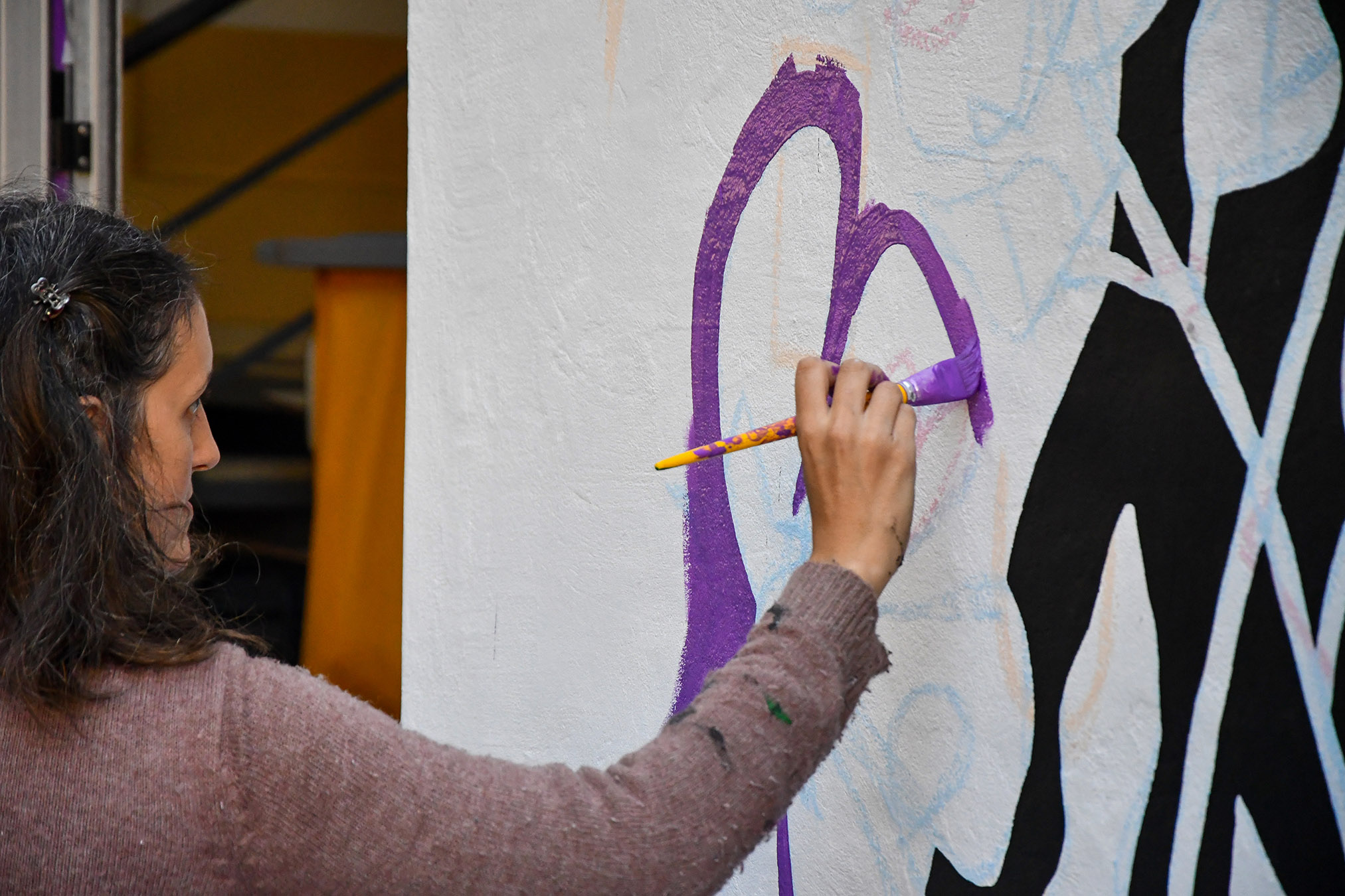 La artista Victoria Falkin había sembrado un bosque de símbolos sobre una pared del patio próxima al baño de mujeres: flores que insisten en crecer y la conexión entre cuerpo y naturaleza; pájaros en vuelo y el simbolismo de las margaritas sin un pétalo evocando la ausencia, la esperanza del regreso, la libertad y la memoria de las personas desaparecidas. Y este día llegaron muchas manos, de estudiantes, docentes y funcionarias, que se animaron a seguir la línea, a dejar su trazo y a hacer suyo ese mural compartido.