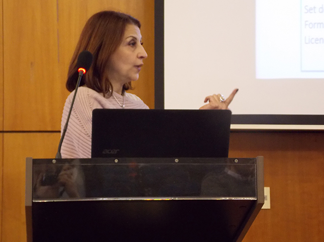 La tercera exposición estuvo a cargo de Alejandra Nardi, Lic. en Bibliotecología y Documentación y directora de la Oficina de Conocimiento Abierto de la Universidad Nacional de Córdoba. La profesora compartió la experiencia de su Universidad en la gestión del Repositorio Digital Universitario y del Portal de Revistas, así como estrategias de desarrollo del conocimiento abierto.