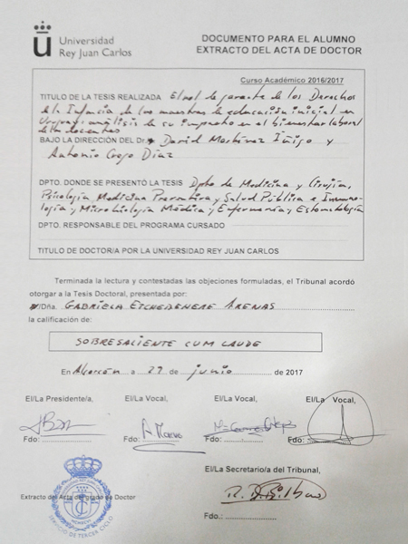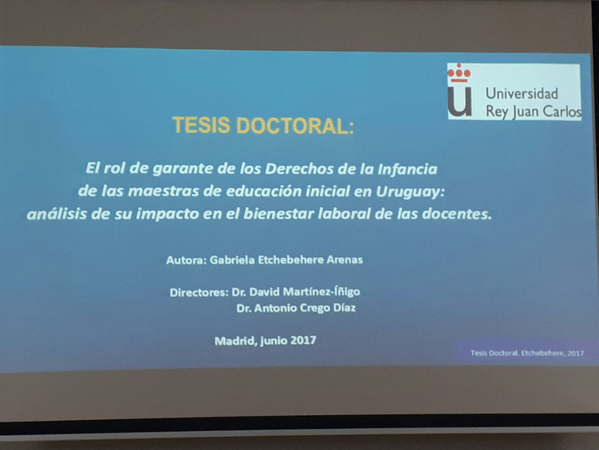 La Profesora Agregada Gabriela Etchebehere Arenas; docente del Instituto de Psicología, Educación y Desarrollo Humano; obtuvo el título de Doctora en Género y Salud, tras la defensa de su tesis titulada “El rol garante de los Derechos de la Infancia de las maestras de educación inicial en Uruguay: análisis de su impacto en el bienestar laboral de las docentes” el día 29 de junio de 2017 en la Universidad Rey Juan Carlos (Madrid, España).