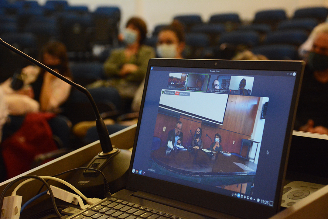 Posteriormente, en el aula magna “Juan Carlos Carrasco” de la misma casa de estudios, se llevó a cabo una mesa de diálogo que fue transmitida en vivo por el canal institucional de la Facultad en Yotube y contó también con una instancia por la plataforma Zoom