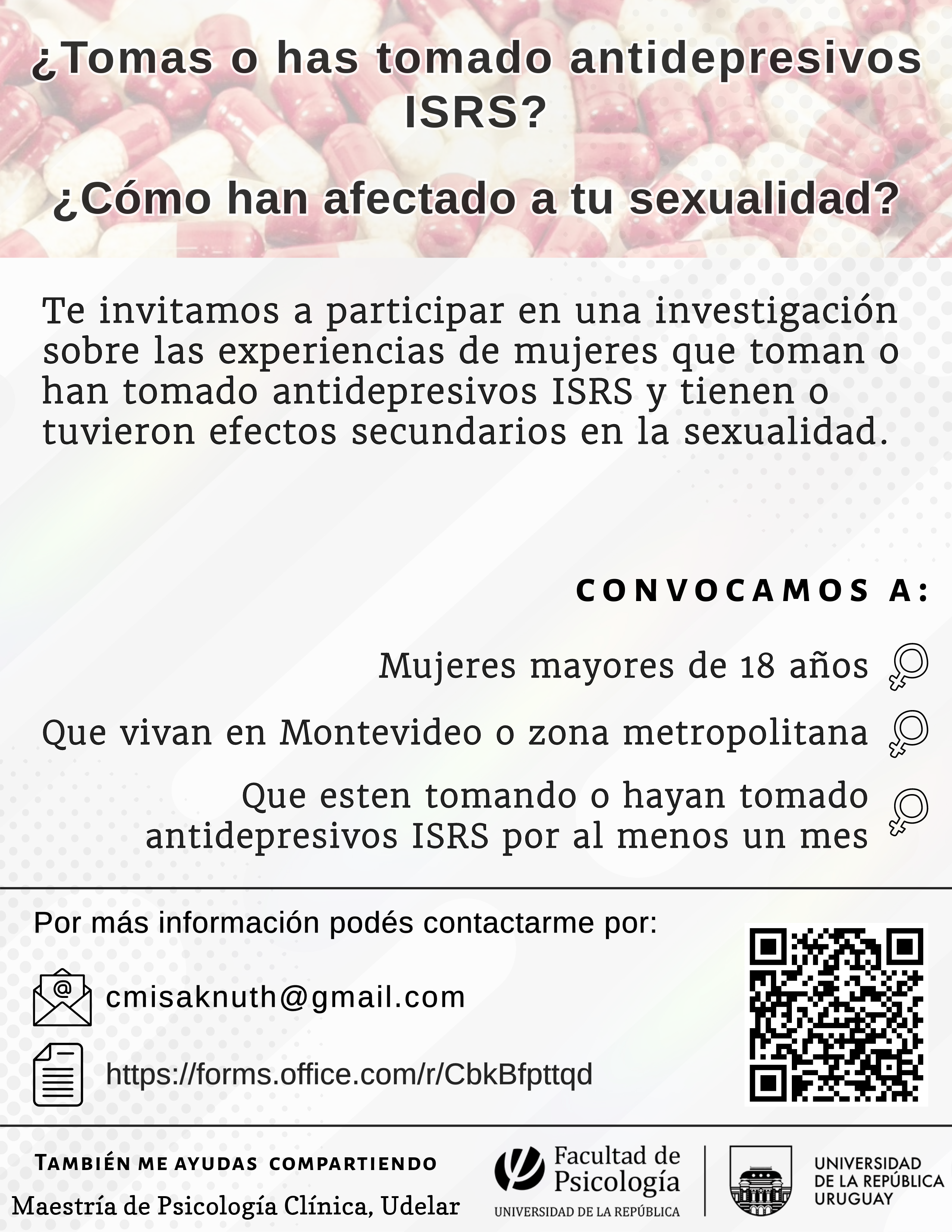 Investigación busca voluntarias para conocer los efectos de los antidepresivos inhibidores selectivos de la recaptación de serotonina sobre la sexualidad de las mujeres. La entrevista tiene una duración de entre 30 minutos y una hora aproximadamente. Se coordina completando este formulario https://forms.office.com/r/CbkBfpttqd
