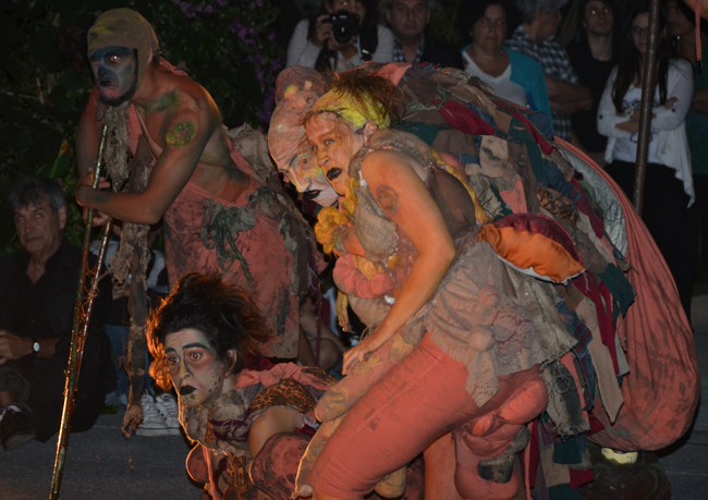 Se escucha un cántico lejano. Las voces se acercan. Súbitamente quedan en silencio. Se escucha un “Shhh!”. Entra un primer bufón, Jorbo, seguido por los demás. Olisquean el aire enfáticamente.