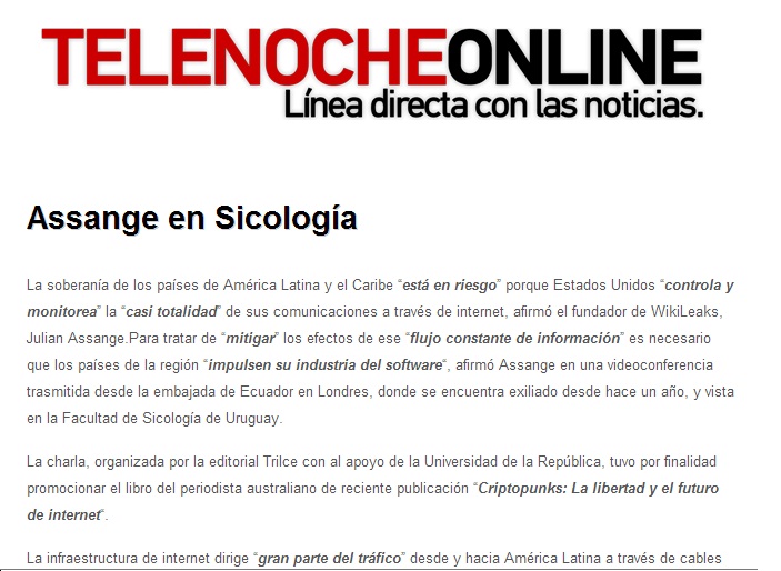 La soberanía de los países de América Latina y el Caribe “está en riesgo” porque Estados Unidos “controla y monitorea” la “casi totalidad” de sus comunicaciones a través de internet, afirmó el fundador de WikiLeaks, Julian Assange.Para tratar de “mitigar” los efectos de ese “flujo constante de información” es necesario que los países de la región “impulsen su industria del software“, afirmó Assange en una videoconferencia trasmitida desde la embajada de Ecuador en Londres, donde se encuentra exiliado desde hace un año, y vista en la Facultad de Sicología de Uruguay.