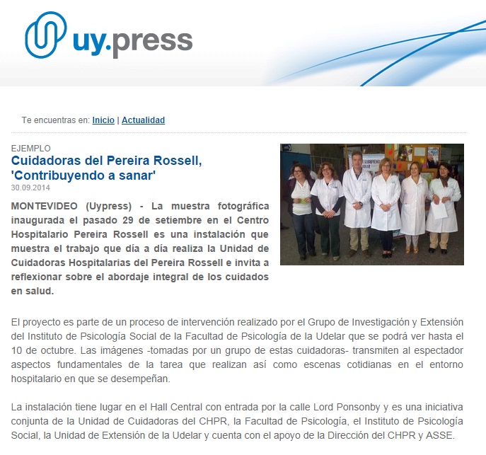 MONTEVIDEO (Uypress) - La muestra fotográfica inaugurada el pasado 29 de setiembre en el Centro Hospitalario Pereira Rossell es una instalación que muestra el trabajo que día a día realiza la Unidad de Cuidadoras Hospitalarias del Pereira Rossell e invita a reflexionar sobre el abordaje integral de los cuidados en salud.