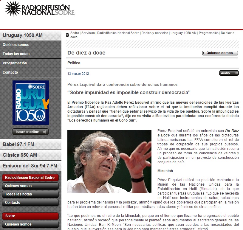 Pérez Esquivel ratificó su posición contraria a la Misión de las Naciones Unidas para la Estabilización en Haití (Minustah), de la que participan fuerzas uruguayas. “Lo que se necesita en Haití son instrumentos de salud, soluciones para el problema del hambre y la pobreza”, afirmó y opinó que los gobiernos que participan en la misión harían bien en relevar al personal militar por médicos, educadores y técnicos de otros perfiles.