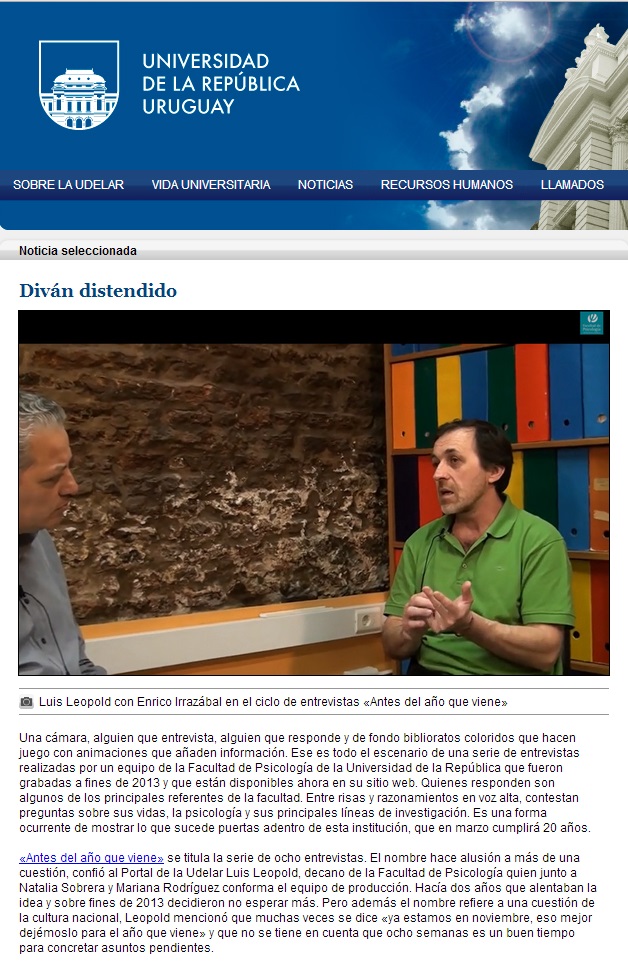 Una cámara, alguien que entrevista, alguien que responde y de fondo biblioratos coloridos que hacen juego con animaciones que añaden información. Ese es todo el escenario de una serie de entrevistas realizadas por un equipo de la Facultad de Psicología de la Universidad de la República que fueron grabadas a fines de 2013 y que están disponibles ahora en su sitio web. Quienes responden son algunos de los principales referentes de la facultad. Entre risas y razonamientos en voz alta, contestan preguntas sobre sus vidas, la psicología y sus principales líneas de investigación. Es una forma ocurrente de mostrar lo que sucede puertas adentro de esta institución, que en marzo cumplirá 20 años.