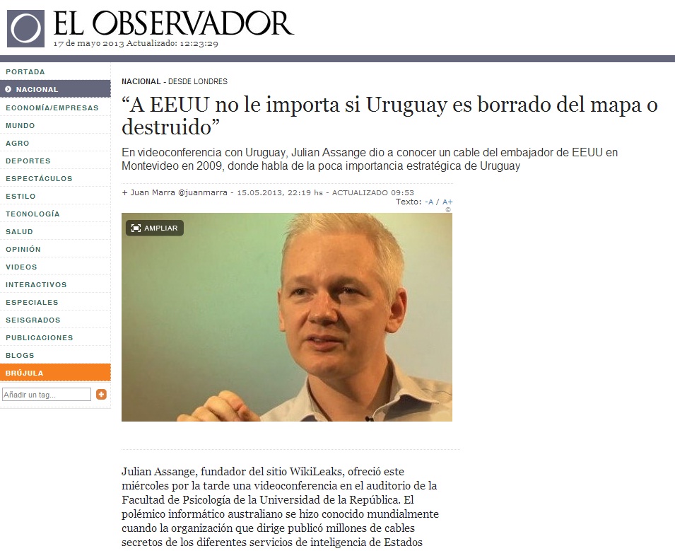 En videoconferencia con Uruguay, Julian Assange dio a conocer un cable del embajador de EEUU en Montevideo en 2009, donde habla de la poca importancia estratégica de Uruguay