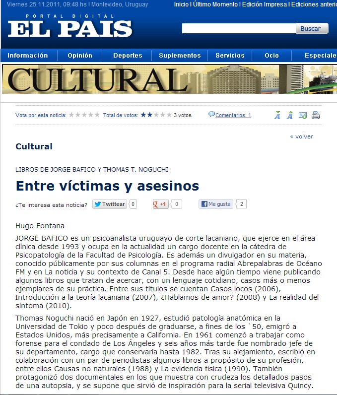 JORGE BAFICO es un psicoanalista uruguayo de corte lacaniano, que ejerce en el área clínica desde 1993 y ocupa en la actualidad un cargo docente en la cátedra de Psicopatología de la Facultad de Psicología. Es además un divulgador en su materia, conocido públicamente por sus columnas en el programa radial Abrepalabras de Océano FM y en La noticia y su contexto de Canal 5. Desde hace algún tiempo viene publicando algunos libros que tratan de acercar, con un lenguaje cotidiano, casos más o menos ejemplares de su práctica. Entre sus títulos se cuentan Casos locos (2006), Introducción a la teoría lacaniana (2007), ¿Hablamos de amor? (2008) y La realidad del síntoma (2010).