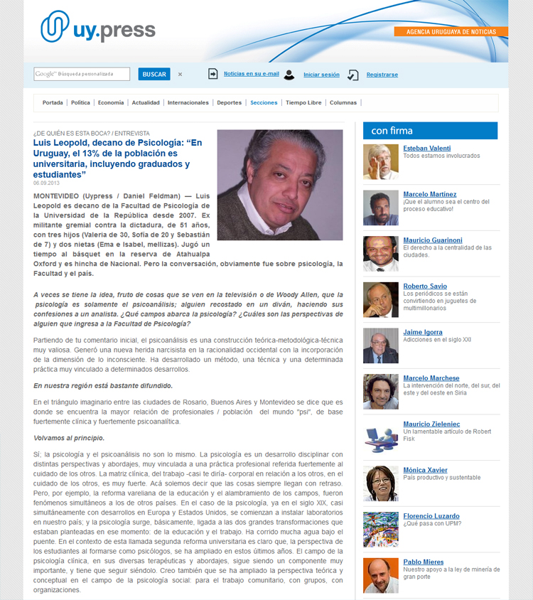 Luis Leopold es Decano de la Facultad de Psicología de la Universidad de la República desde 2007. Ex militante gremial contra la dictadura, de 51 años, con tres hijos (Valeria de 30, Sofía de 20 y Sebastián de 7) y dos nietas (Ema e Isabel, mellizas). Jugó un tiempo al básquet en la reserva de Atahualpa Oxford y es hincha de Nacional. Pero la conversación, obviamente fue sobre psicología, la Facultad y el país.