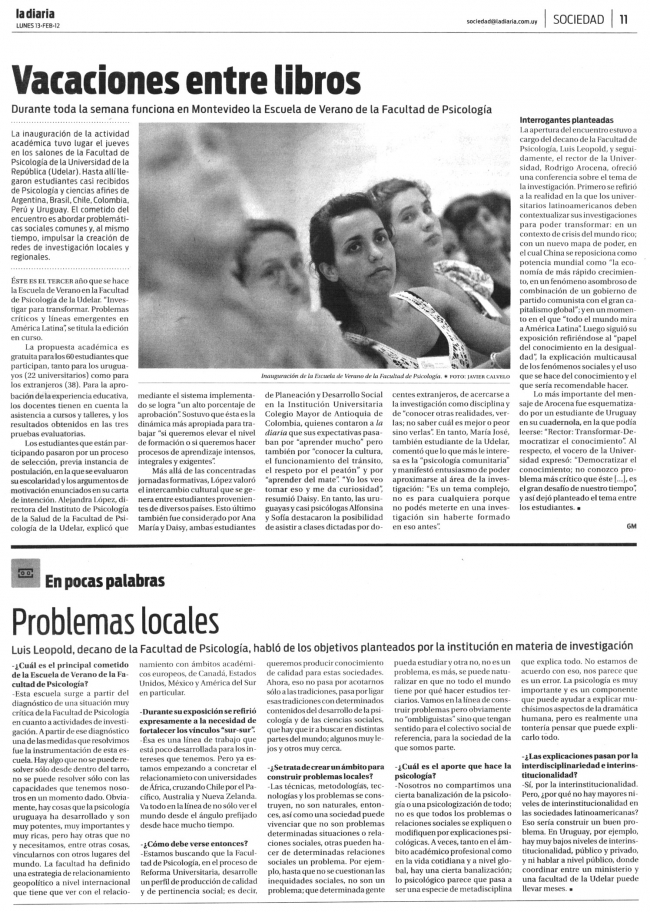 Nota de prensa relacionada al lanzamiento de la Escuela de Verano -edición 2012- y entrevista al Decano de la Facultad de Psicología, Lic. Luis Leopold.